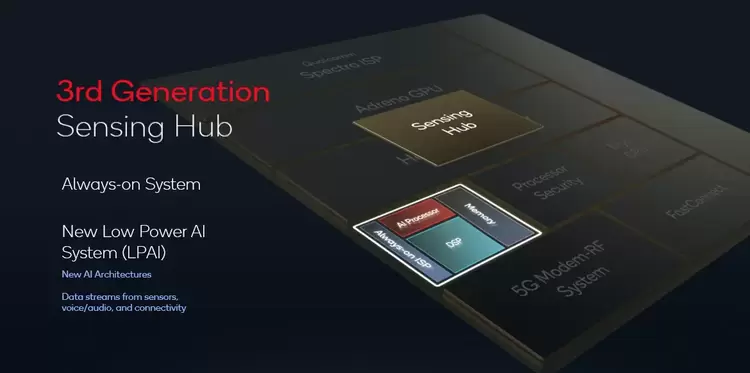 此外,骁龙8集成的第3代高通传感器中枢能够以极低功耗利用AI处理更多数据信息,这是一套始终运行的低功耗AI方案。硬件指标上,其相比前代平台性能提升75 %,功耗降低50%。其更多用于处理包括语音、音频、传感器和连接的情境数据流,比如语音助理、活动检测和环境理解等。