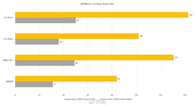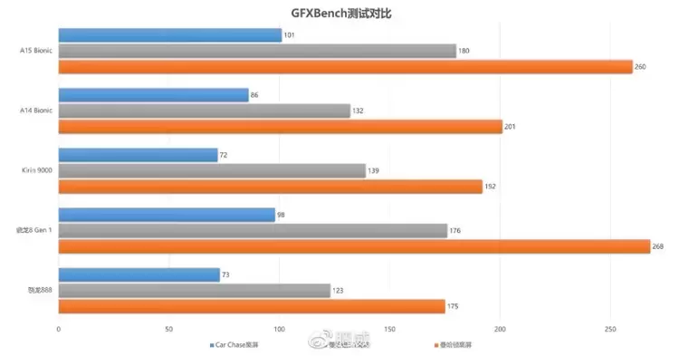 此外,自媒体肥威等均在测试中表达了对骁龙8 GPU性能的赞赏。根据其测试数据显示,骁龙8和苹果A15不相上下,“打得有来有回”(GFXBench测试)。