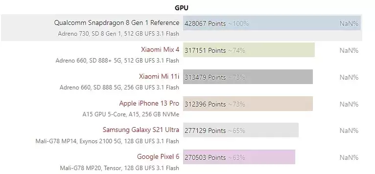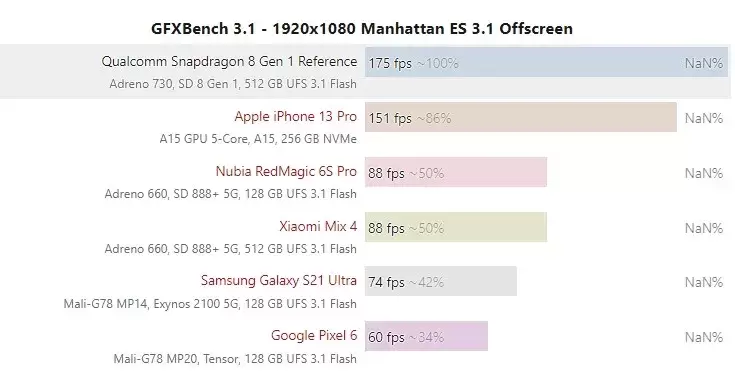 而在GPU层面,媒体Zealer评价全新Adreno具有“巨大的提升幅度,让骁龙8硬钢苹果A15”,据其通过知名图形跑分软件GFXBench测试结果显示,骁龙8 QRD在多个项目中战胜了iPhone 13 Pro,大家比较看重的GFXBench曼哈顿 3.1 离屏测试项目上,骁龙8最终成绩175fps,高于iPhone 13 Pro。