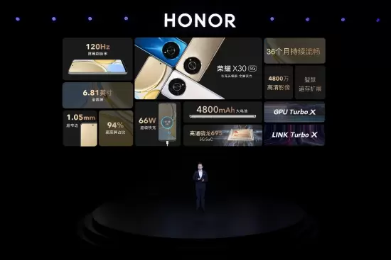 本次荣耀周年庆还带来了荣耀X系列的八年诚意之作——荣耀X30。 荣耀X系列是荣耀的明星系列之一,坚持用高品质交朋友,荣耀3X至今仍有超4万老朋友在使用。快充长续航,全屏实力,荣耀X30为用户带来更安全的66W超级快充、4800mAh大电池超长续航、1.05mm的“卡片级”超窄边框,堪称窄边直屏天花板。此外,荣耀X30搭载全球首批高通骁龙695芯片,配合荣耀系统级调优技术,为用户打造36个月不卡顿的流畅使用体验,久用如新。