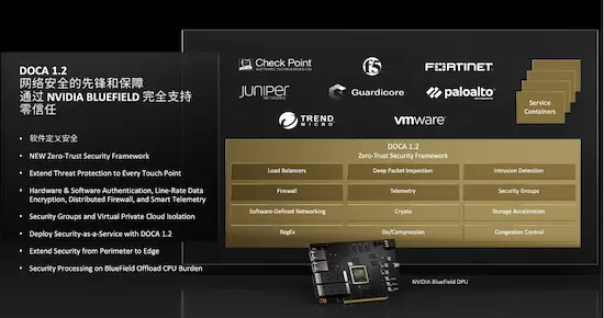 今年秋季GTC大会上,英伟达专门发布了面向零信任的安全架构DOCA 1.2。“DOCA 1.0、DOCA 1.1、DOCA 1.2每个版本发布时都会有其针对性的市场,DOCA 1.2主要是面向安全。”宋庆春介绍,在这一版本中提供了API 面向Load Balancers、DPI、 IPS、IDS、下一代防火墙,设计安全软件的用户或者安全软件的供应商可以直接通过DOCA API调用在DPU里的硬件加速引擎,让数据中心更安全。