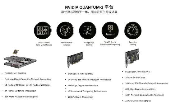 英伟达在秋季GTC大会上推出的新一代Quantum-2 InfiniBand网络平台,以400Gbps InfiniBand作为基础搭配Quantum-2 交换器、ConnectX-7网卡、BlueField-3 InfiniBand DPU与支持新架构的软件构成。可提供云原生上需要的五个关键功能:多租户、性能隔离、拥塞控制、SHARP Gen 3网络计算、高精度计时。