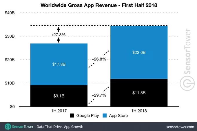 据phoneArena北京时间7月17日报道,今年上半年,全球应用营收同比增长27.8%至344亿美元,不出人意料的是,苹果App Store在其中仍然占有相当大一部分。