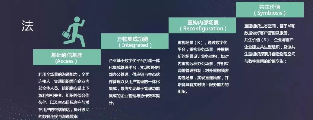企业价值成长路径从基础通信基座(Access)、万物集成功能(Integrated)、到重构组织内部场景(Reconfiguration)以及基于AI的共生价值(Symbiosis)四大增值空间层层递进,最终形成了全新的“AIRS价值增值环”理论。AIRS聚焦数字化管理的新模型,是以人为中心,辐射到企业内外部以及产业链上下游,联动物与系统,由此又重构连接合作伙伴、供应链以及用户/客户的场景,最终企业与客户建立共生型组织。