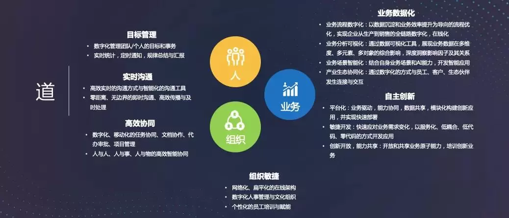 在业务方面,数字化转型能够帮助实现业务数据化,实现业务流程数字化即企业业务全链路数字化和在线化。通过业务数据化实现可视化的业务分析、智能化的业务场景和可协同的产业生态。