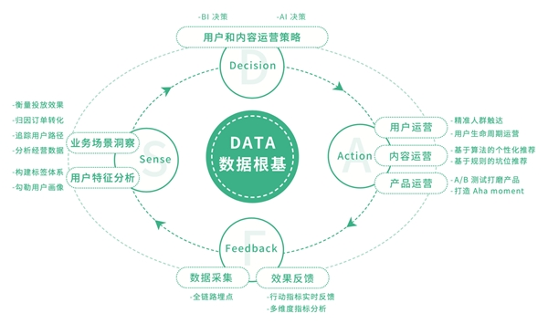在任何一个产品迭代过程中,都可以总结为基于数据流的企业运营框架 SDAF,集感知(Sense)、决策(Decision)、行动(Action)、反馈(Feedback)为一体,基于数据这一中心,让所有角色、所有业务流程都能够在闭环中发生作用。