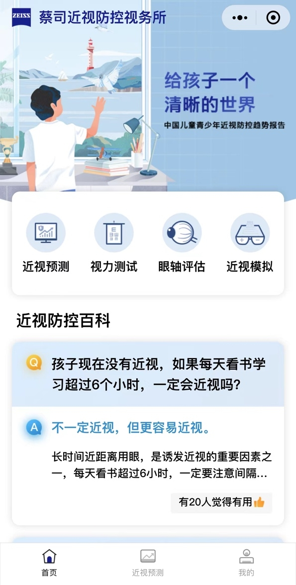 卡尔蔡司被业界称为“光学领导者”,拥有 175 年历史,是一家在光学及光电行业中举足轻重的跨国科技企业,怀揣着不懈追求超凡的极大热情,为客户创造价值,并激发世界以全新的方式进行视觉体验。2020 年 9 月,「蔡司近视防控视务所」正式落地,通过分享全面的近视防控知识、提供视力测试、屈光发育档案管理和近视风险预测等近视防控管理,大大提高全民近视防控能力和效率、降低中国儿童青少年近视率。