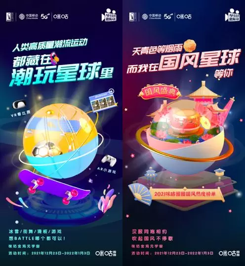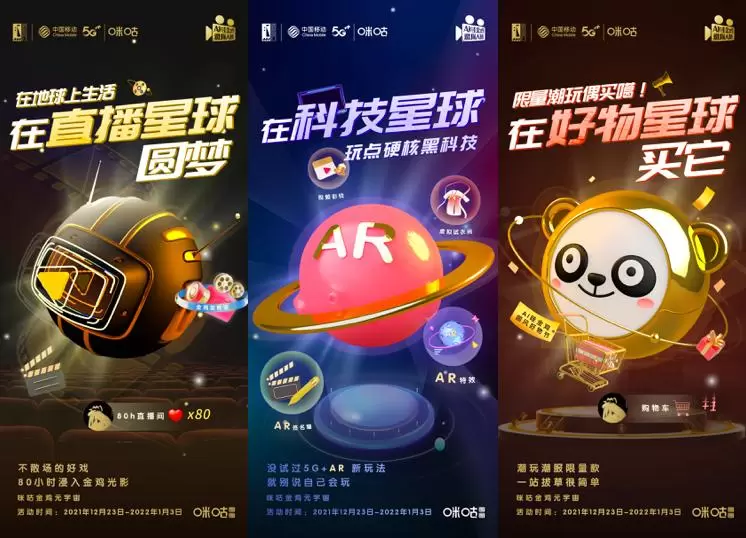 延续2020年“云上金鸡节”的技术定位,在2021年全面升级的金鸡“元宇宙”线上专区中,中国移动咪咕以5G+AR技术为基础整合各项优势资源,结合超高清视频、视频彩铃、云VR、云AR等业务形态,倾力打造“直播星球”、“科技星球”、“好物星球”、“潮玩星球”和“国风星球”五大板块,满足用户5G时代电影节观影需求。