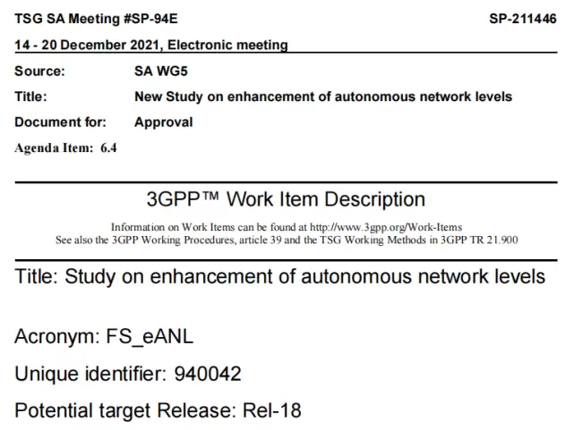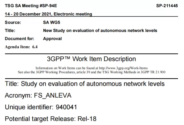 2021年12月20日,在3GPP 业务与系统技术规范组(TSG SA)第94e次全体会议上,由中国移动牵头的自智网络分级(Autonomous Network Level)标准项目通过会议审议,输出TS 28.100 (Rel-17)标准规范。同时,中国移动联合华为、亚信科技、中国联通、中国电信、中兴通讯、中国信科、联想、摩托罗拉、英特尔等提交的《自智网络分级增强技术研究》和《自智网络分级评估方法研究》两项Rel-18新立项在会议上通过审议。