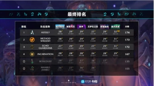 在比赛中,于最后一日揭晓的地图通灵战潮成为了比赛的关键。Echo Guardians,Method SHEEESH,Aster.Y剩下的三支队伍围绕通灵战潮展开争夺。对于Aster.Y而言,通灵战潮他们非常熟悉。赛后,Aster.Y的法师清心坦言,他们在平时的练习中,就已经把通灵战潮打到过33层以上。因此,从比赛一开始,通灵战潮就完全成了Aster.Y的表演秀,他们也在比赛中成功限时32层通灵战潮,创造了世界纪录!