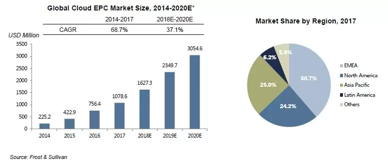 报告显示,全球云化EPC市场2014至2017年的年均复合增长率高达68.7%。在区域市场中欧洲和中东地区占比最大,其次是亚太和北美。报告预测,2018至2020年,云化EPC市场总量还将保持接近40%的增长率。