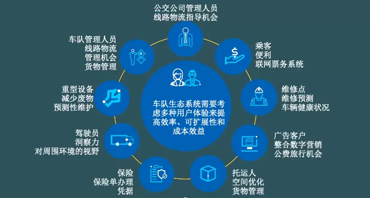 通过领先的端到端技术,英特尔正在与伙伴合作,为全球交通运输市场提供各种车队解决方案,该生态广泛覆盖车队管理人员、重型设备、驾驶员、保险、托运人、广告客户、维修店、乘客、公交公司管理人员等各种角色,旨在提升车队的效率、可扩展性和成本效益。