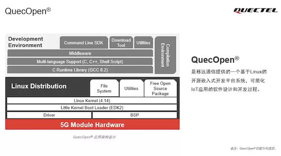 另外,移远通信还提供了一个开放性的软件开发平台QuecOpen,作为一个基于Linux的开源嵌入式开发平台系统,可简化IoT应用的软件设计和开发过程。“因为5G的成本相对较高,我们需要为客户思考如何优化整机成本,所以我们推出了这一方案。”移远通信5G产品总监马振龙表示。简单来说,QuecOpen就是基于移远通信的5G模组为底层,通过开放接口的方式,方便客户将已有程序或期望功能移植到模组中,由此可以节省一些主控或控制芯片的合录,进而方便快捷的进行产品迭代。