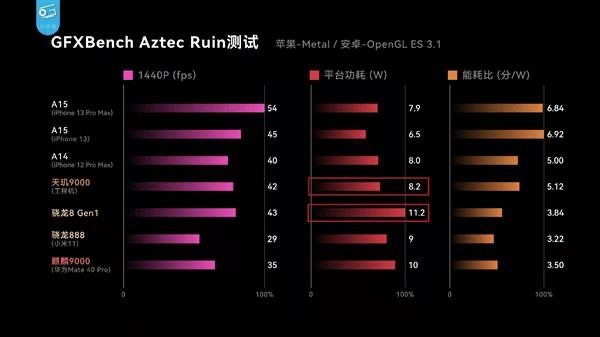 GFXBench对 GPU的测试中,天玑 9000的功耗比新骁龙8低了26.7%