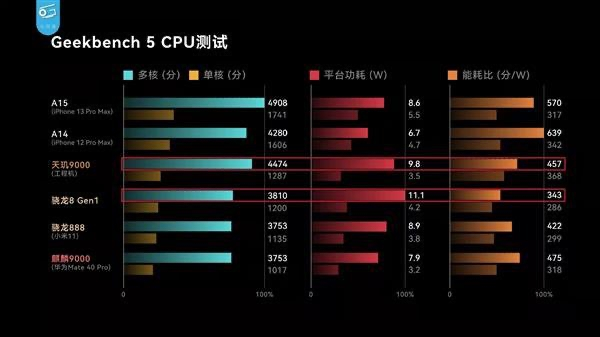 Geekbench 5 对CPU的测试中,天玑 9000的功耗比新骁龙8低了11.7%