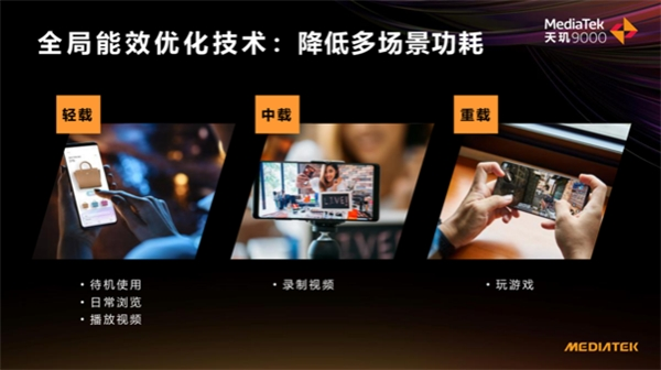 据联发科官方介绍,全局能效优化技术通过全方位覆盖芯片的不同IP模块,实现全场景功耗优化。简单来说,就是可以根据用户的实际使用场景,将手机的负载分为轻载、中载以及重载三档,在不同的场景下使用对应的能效优化策略,并最终降低手机功耗。