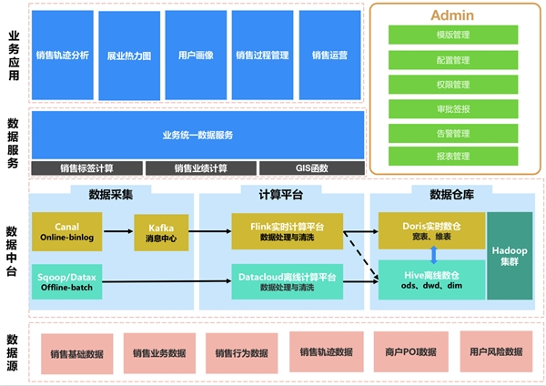 2.数据中台。提供数据采集、离线计算、实时计算、数据仓库等基础设施。