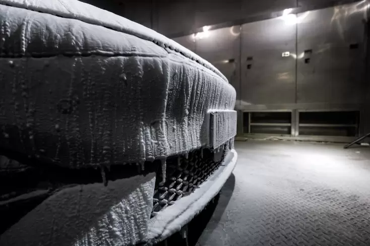 经过整备后,中汽研的工作人员正式启动检测,首先是远程低温启动测试,当工作人员按下手机上的远程启动键,小鹏P5瞬间启动成功,快于国标要求的7秒内启动;其次是检测车辆的除霜速度,车辆启动之后,小鹏P5的立即进入工作状态,20分钟内前车窗除霜达99.8%(高于国标要求的20分钟除霜80%);在40分钟内就已除霜达到100%(高于国标要求的40分钟除霜90%),且风挡玻璃无模糊、不影响驾驶员视线。
