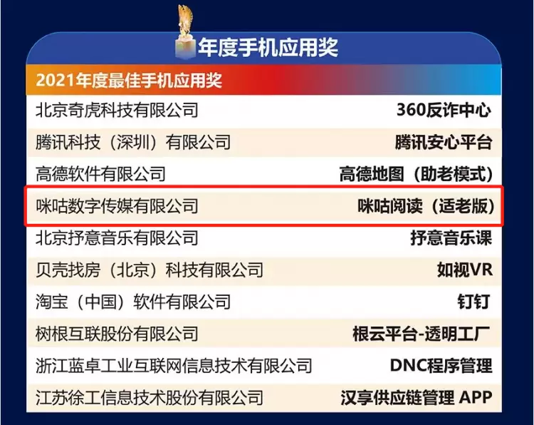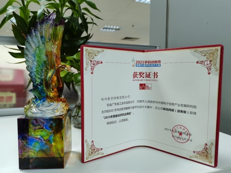 12月23日,2021年手机创新周暨第九届手机设计大赛落地收官活动——20215G终端全球创新峰会(第三届)暨第九届手机设计大赛天鹅奖颁奖礼在云端举行。会上,中国手机设计最高奖“天鹅奖”重磅揭晓,咪咕数字传媒有限公司咪咕阅读APP适老版荣获“最佳手机应用奖”。