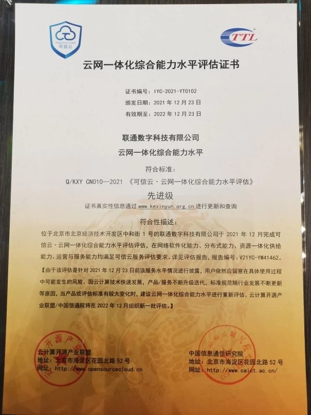 联通云作为首批通过云网一体的云商,在2020年率先通过云管理服务提供商能力认证,评级为最高级别-卓越级。并在今年再次通过云网一体化综合能力评估,进入客户在各类云场景下的优选云商范围。