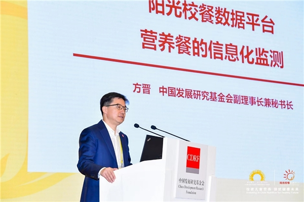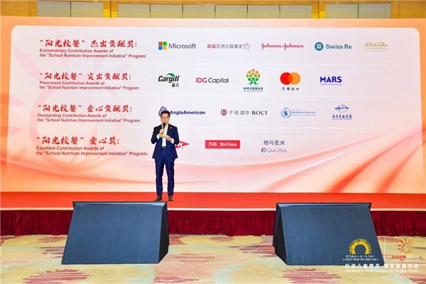图为中国发展研究基金会副理事长兼秘书长方晋公布微软中国荣获“阳光校餐“杰出贡献奖