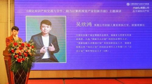 会上,美图公司创始人兼首席执行官吴欣鸿作为联盟第一届理事长发表主题为《深化知识产权交流与合作,助力计算机视觉产业创新升级》的演讲。