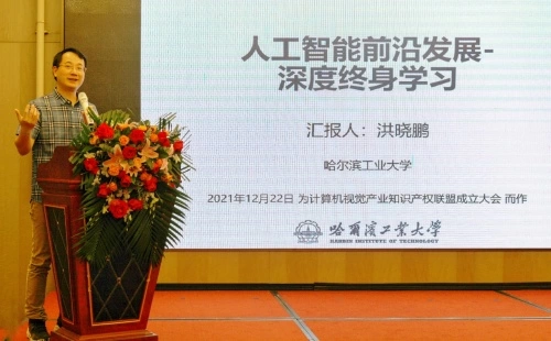 大会现场,哈尔滨工业大学教授洪晓鹏发表主题为《人工智能前沿发展--深度终身学习》的演讲,与行业嘉宾分享科技前沿趋势。