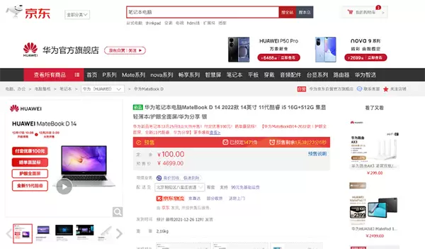 2022款HUAWEI MateBook D14/D15,处理器升级为最新的i5-1155G7和i7-1195G7,起售价4699元。华为MateBook D14/15 2022款分别搭载了14英寸和15.6英寸的屏幕,16:9比例,三边微边框设计,100%sRGB色域,300nit亮度。屏幕采用DC调光无频闪的设计,并且获得德国莱茵低蓝光护眼认证,能够有效缓解用户用眼疲劳,非常适合需要长时间伏案办公和学习的年轻人。目前,该款电脑正在京东预售中,支付100元定金即可省100元,喜欢的抓紧啦。