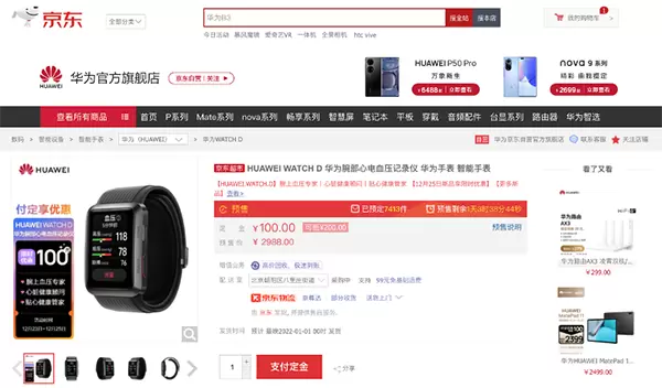 HUAWEI WATCH D腕部心电血压记录仪,采用长方形的表身设计,搭载2.5D玻璃的表镜与高硬度铝合金材质的中框;侧面放有HOME键与HEALTH键,支持了血压测量和心电采集两大健康监测功能,并且都通过了药监局二类医疗器械注册。目前,HUAWEI WATCH D腕部心电血压记录仪正在京东火热预售中,华为京东超级品牌日活动期间,支付100元定金可抵200元,到手价2888元。