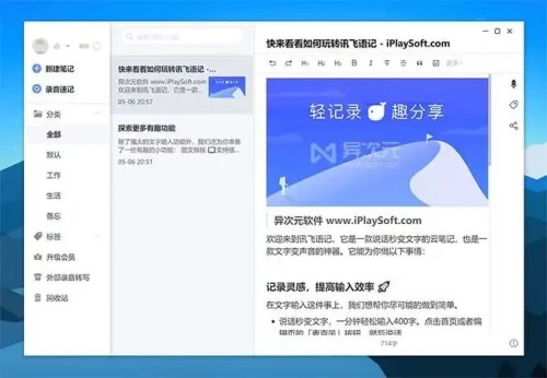 讯飞语记支持 Android、iOS、Windows、macOS 以及网页版,可以实现多设备跨平台的资料同步。除了语音听写之外,它也集成了 OCR 拍照文字识别 (支持中英文夹杂、手写字体识别)、图文编排、智能任务提醒、一键收藏文章图片链接等笔记软件必备的功能。