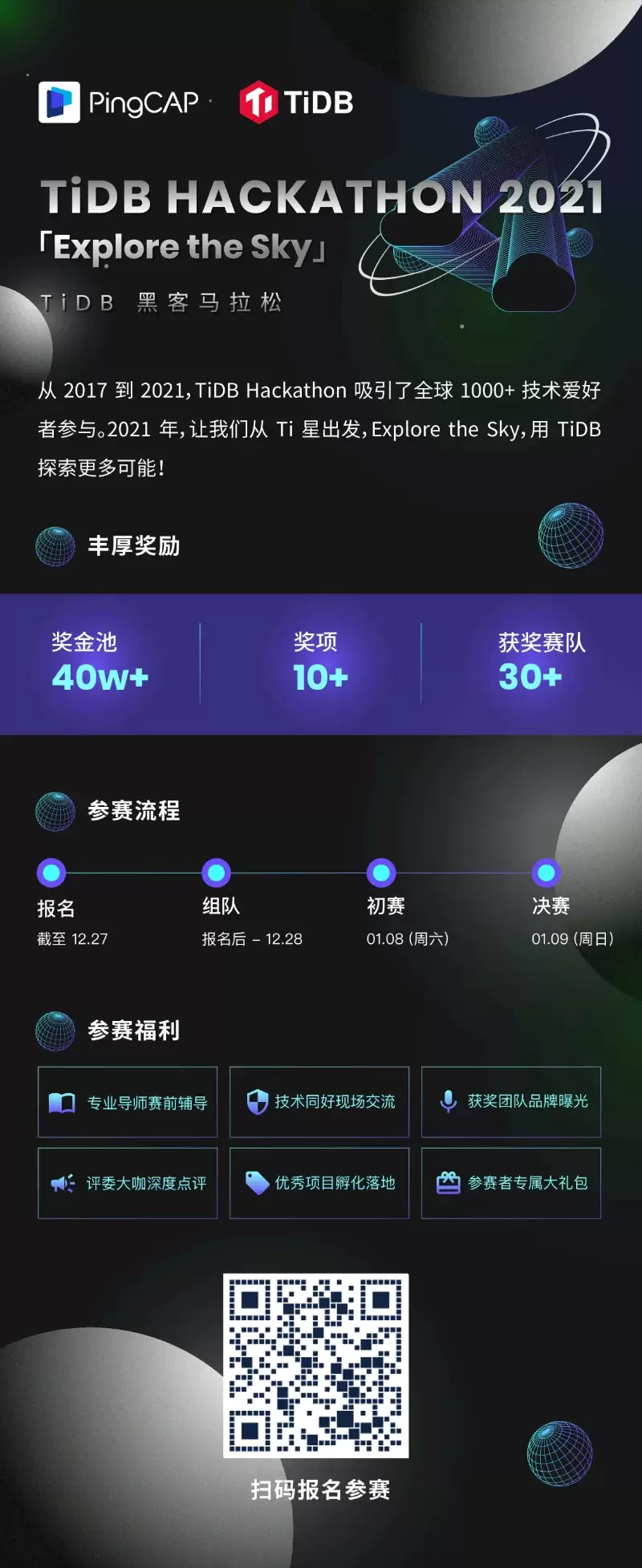 本届 Hackathon 主题为「Explore the Sky」,将在 2022.1.8 - 9 两个比赛日进行开发,线上线下联动。从 Ti 星球到宇宙苍穹,我们用 Hacking 连接更广泛的生态,给予参赛者尽情发挥的想象空间。本届 Hackathon 我们对赛道进行了全面升级,开辟出内核、工具、生态、「∞」四大赛道,参赛者不论是数据库开发者,数据库上下游生态,还是数据库的使用者,都可以找到适合的领域,围绕 TiDB 探索无限可能。