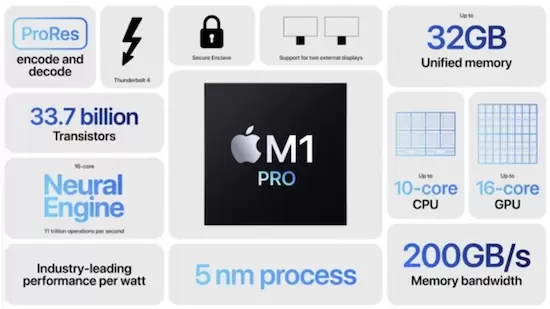 不过,更值得注意的是,相比于头几年PC市场处理器的挤牙膏,今年延续了去年苹果M1开始动辄性能翻几翻的特点。今年伴随MacBook Pro 14寸及16寸发布推出的 M1 Pro/M1 Max,更是可谓疯狂堆料,CPU性能相比M1再提升70%,GPU速度提升最高4倍,NPU速度提升3倍。其中,M1 Pro 芯片采用 5nm 制程工艺,封装了337亿个晶体管,配备10核 CPU,拥有8个高性能核心与2个高能效核心。M1 Max芯片在M1 Pro的基础上,将内存带宽提高至最高400GB,并配有最高64GB的统一内存。M1 Max拥有570亿个晶体管,比 M1 Pro多出70%;其同样配备10核CPU,并配有最高32核GPU,这也让它的图形处理速度是M1的4倍。