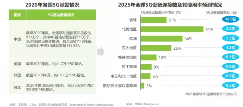 第三,各国发力 5G 基站建设,到 2025 年,全球 5G 连接设备预计达 18 亿,5G 连接设备使用率将达 21%。中国现阶段 5G 基站数量最多,2020 年中国新增 5G 基站超 60 万个,全部已开通 5G 基站超过 71.8 万个,仍是市场增长的主要驱动力。