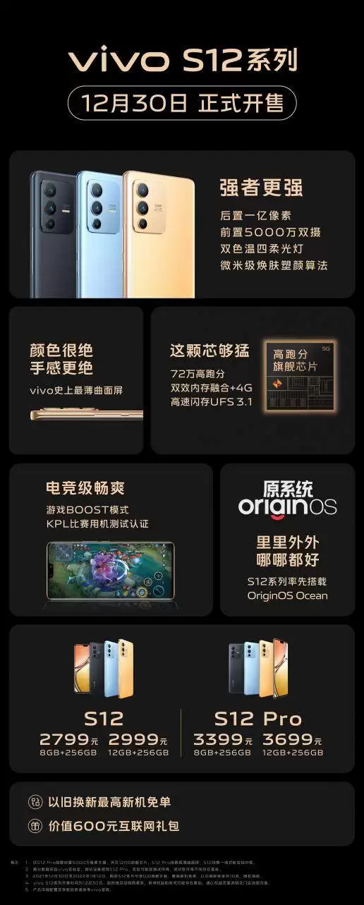 12月30日,vivo官方发布开售海报,官宣新一代先锋影像旗舰vivo S12系列正式全网首销。后置1亿像素+前置5000万双摄、vivo史上最薄曲面屏、高跑分旗舰芯片、电竞级体验,以及OriginOS Ocean系统,vivo S12系列真正做到了“里里外外、哪哪都好”。现在购机,以旧换新最高可享新机免单,还可获得价值600元的互联网礼包。