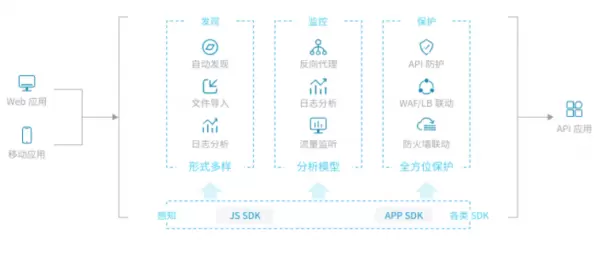 API多维度感知:通过JS和SDK、流量分析,与各类API来源应用进行集成,对环境信息、API账号信息等进行感知。
