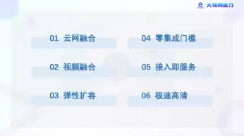 中国移动行业大视频能力具备云网融合、视频融合、弹性扩容、零集成门槛、接入即服务和极速高清等六大优势。