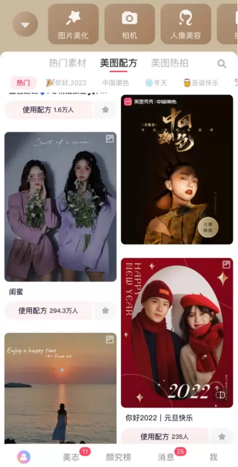 变美丽最重要的一步,进入美图秀秀,在首页就能看到“美图配方”功能,从场景分类里选择你喜欢的配方,一键套用到自己的影像上,就能快速完成新年大片创作和美化,完全不需要繁琐的修图步骤。