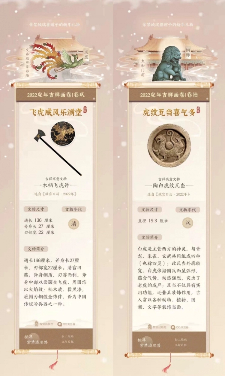 解锁瑞兽后,用户还将获得瑞兽赠予的“2022虎年吉祥画卷”,卷中展示和老虎有关的文物,比如“临袁侯铜虎符”“陶白虎纹瓦当”“白玉镂雕双虎环佩”等,并且详细地展示了文物的年代、尺寸、用途等介绍。