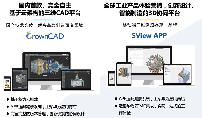 ●CrownCAD是国内首款完全自主的基于云架构的三维CAD平台,完美适配了高端业制造面临的多场景需求。该平台同样基于华为云构建,以华为云海量弹性资源为基础实现了资源的无限扩展,同时联合华为云生态提供的制造业上下游整体智能制造解决方案,更好地满足了制造业数字化转型需要。