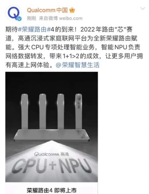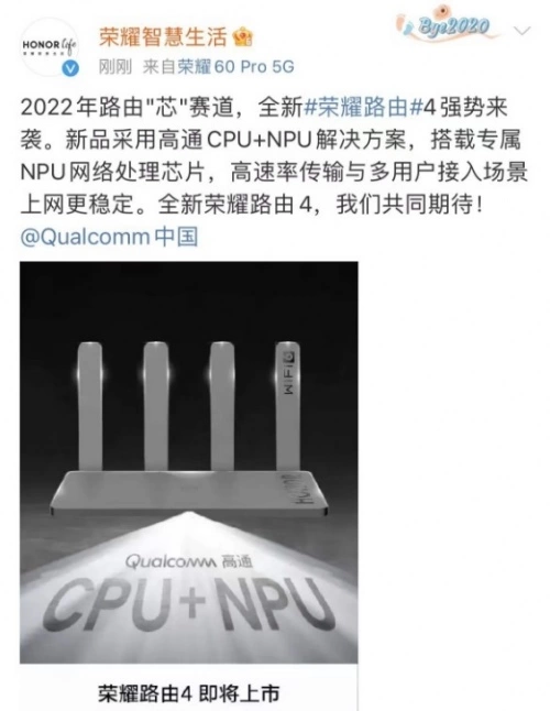 今日,荣耀官方微博发布全新荣耀路由4将于1月5日与大家见面的预热信息,透露荣耀路由4将采用高通CPU+NPU解决方案,搭载专属NPU网络处理器,重新定义路由新标准,让更多用户体验高速率及稳定传输的网络体验。与此同时,高通官方也转发评论,表示期待荣耀路由4的到来,并通过高通沉浸式家庭联网平台为荣耀路由赋能,带来1+1>2的成效。