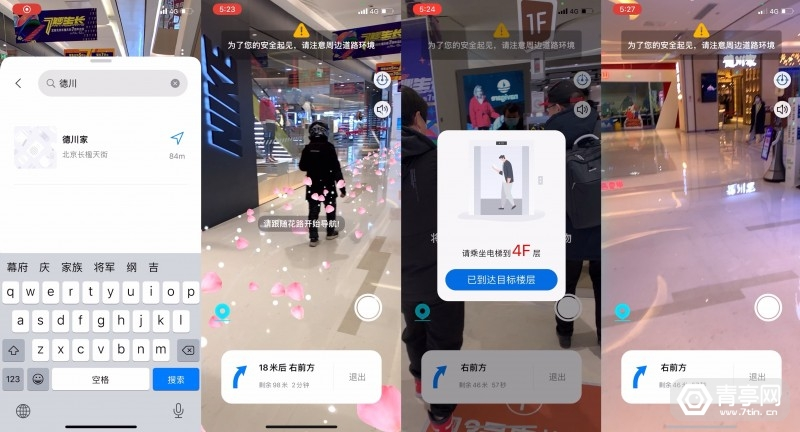 其中AR实景导航支持所有商场内设置了POI的店铺,只需在App底部搜索框内输入店铺名,均可完成AR导航,并且支持跨楼层,可以从商场刚进门导航到4楼的餐馆,使用十分便利。有了这种体验,基本上就相当于把商场放进手机、装进口袋的感觉。