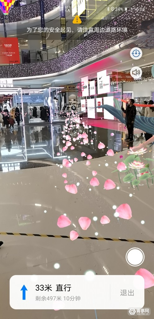 体验时我也注意到几个特点,如:我在商场内任何位置都可随时开启,只需点击扫描,几秒钟后即可进入虚实融合空间、高稳定性及厘米级AR导航、支持展示多个虚拟场景、虚拟物体永久锚定、遮挡效果等。