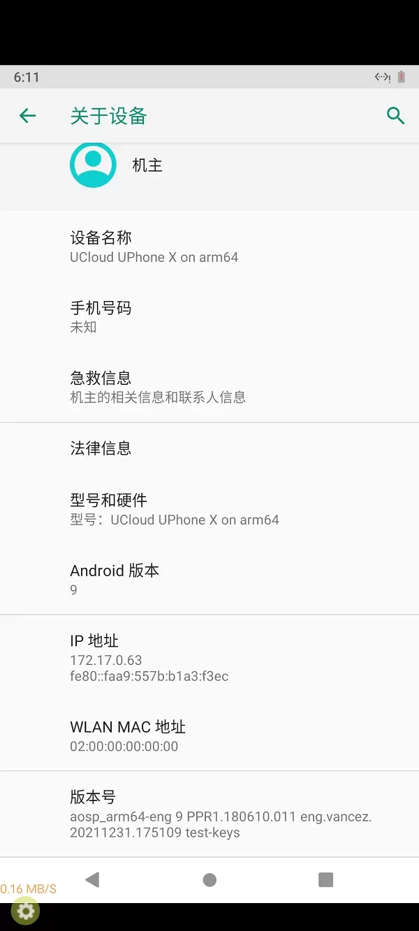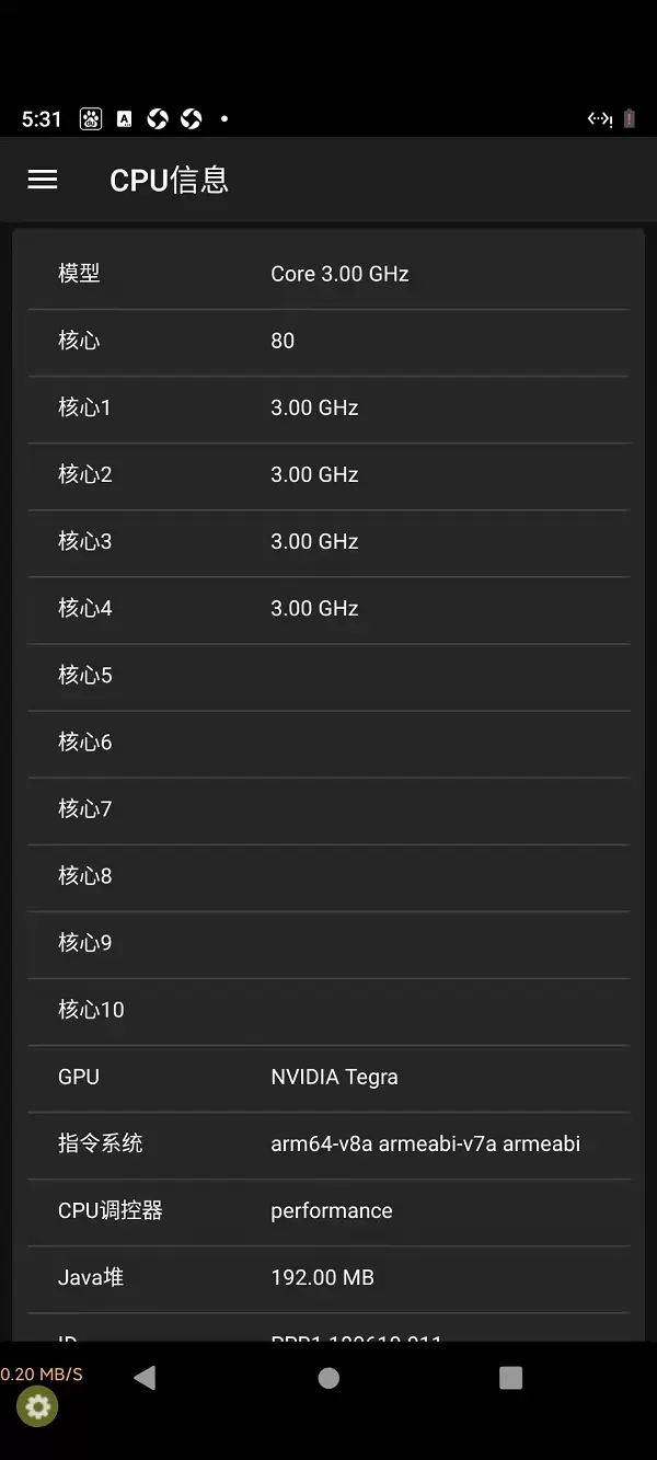 我体验到的云手机的配置信息如图,系统是原生的AOSP安卓9,硬件信息显示叫UPhone X on ARM 64,这是云手机服务的名字,用软件查看一下CPU的信息,只知道是4核配置,全四核都是3G Hz的主频!