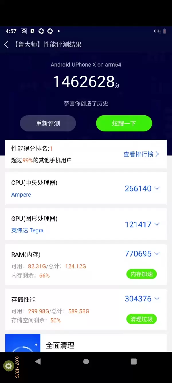 系统识别是80核心,但跑分中实际只用到了4核,系统显示的124G DDR4 3200服务器内存,其实只用到了5G,服务器的内存比手机的内存可快得多。存储方面,使用的是500G的闪存盘。GPU用的是一块完整的英伟达Tegra独立显卡。