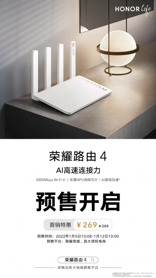 荣耀于1.5日10:08分正式开启全“芯”升级荣耀路由4的预售,这款路由在芯片、组网等方面较上一代进行了大幅度升级,截止到1月12日10:08分,用户购买荣耀路由4均可享受30元的特惠,到手269元可以说极具质价比了!这款全新亮相的荣耀路由4,对于大户型家庭来说,可以说很好的解决了多人联网卡顿、房间面积大导致网络死角等问题,荣耀在新年到来前推出此款路由,想必解决了很多消费者对网速有严苛要求的迫切需求。