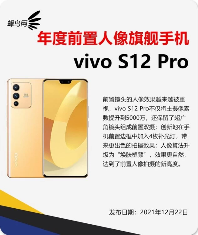 先锋影像旗舰vivo S12系列一经开售,便凭借轻薄优雅的设计、自然出色的影像体验与综合强悍的性能获得了主流媒体的一致点赞。首销当日获得了迪信通、国美、京东五星电器、苏宁易购等九大平台销量、销售额双冠军。2022年1月6日,vivo S12 Pro又获得了“年度前置人像旗舰手机”称号,影像实力再获认可。