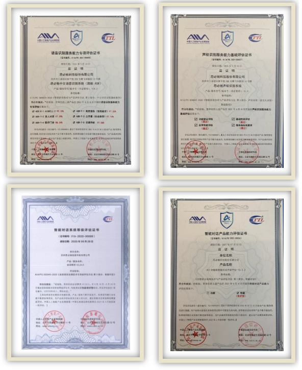 思必驰中文语音识别系统、声纹识别服务、智能对话等多项技术均通过中国信通院认证,获得《语音识别服务能力专项评估证书》、《声纹识别服务能力基础评估证书》《智能对话系统等级评估证书》、《智能对话产品评估能力证书》。
