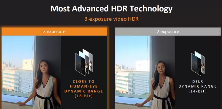 Imagiq 790 ISP支持3曝HDR视频拍摄,由下图可以清晰地看出,相比14Bit单反相机拍摄的双重曝光视频,Imagiq 790 ISP拍摄出的18Bit三重曝光视频的动态范围更接近于人眼,暗部细节更清晰,画面对比度也更高,色彩也更逼真自然。抛开专业复杂的拍摄设备不谈,当今的旗舰手机就能达到这样惊艳的效果,对于如B站这类视频平台的绝大多数up主而言非常具有吸引力。