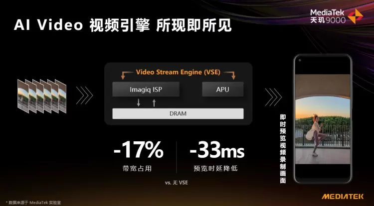 全新 Imagiq 790 ISP支持AI Video视频引擎,结合ISP与APU协同运算,使带宽占用降低17%,预览时延降低33ms,有效减少相机所拍摄的画面与屏幕显示画面之间的延迟,提高视频拍摄体验。将高能效的APU与性能强大的ISP相结合,天玑9000带来了当今最先进的计算摄影技术。