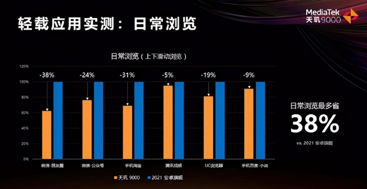 从联发科公布的数据看来,轻载应用的场景下,天玑9000相比2021年安卓旗舰,最多可降低多达38%的功耗,这其中就包括了在线视频播放的场景。
